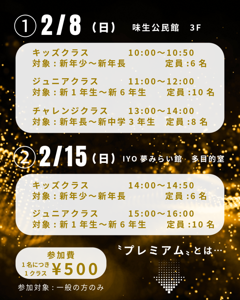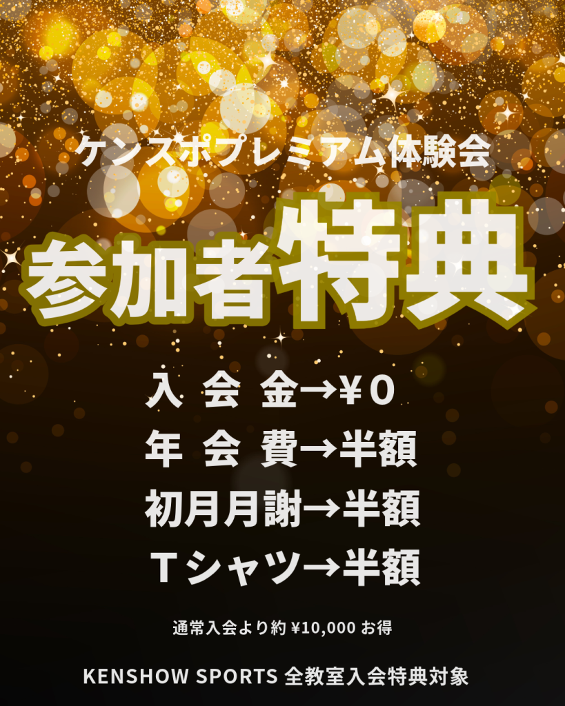 NEWS&TOPICS 01 11 💎プレミアム体験会💎 ケンスポプレミアム体験会🤸予約受付中‼️ ケンスポへお得に入会するチャンス‼️ この時期限定のプレミアムな特典🤩 ※定員になり次第、予約受付終了(キャンセル待ち)となります。 🟢予約方法🟢 Step.1 KENSHOW SPORTSライン公式アカウントを友だち追加 Step.2 下記をトーク画面に入力し送信 ・【プレミアム体験会予約】と入力 ・日程番号(①or②) ・参加希望クラス ・お子様のお名前(フリガナ) ・新学年 体操教室 松山 伊予 ケンショウスポーツ Category :お知らせ « 🏆KENSPO CUP🏆 Category お知らせ ご利用者の声 Archive 2026年1月 2025年12月 2025年10月 2025年6月 2025年2月 2024年12月 2024年7月 2024年6月 2024年3月 2023年11月 2023年7月 2023年6月 2023年5月 2023年4月 2023年2月 2022年11月 2022年10月 2022年9月 2022年8月 2022年7月 2022年6月 2022年3月 2021年11月 2021年10月 2021年8月 2021年7月 2021年6月 2021年2月 2020年11月 2020年10月 2020年4月 2019年12月 2019年11月 2019年9月 2019年8月 2019年7月 2019年6月 2019年5月 2019年4月