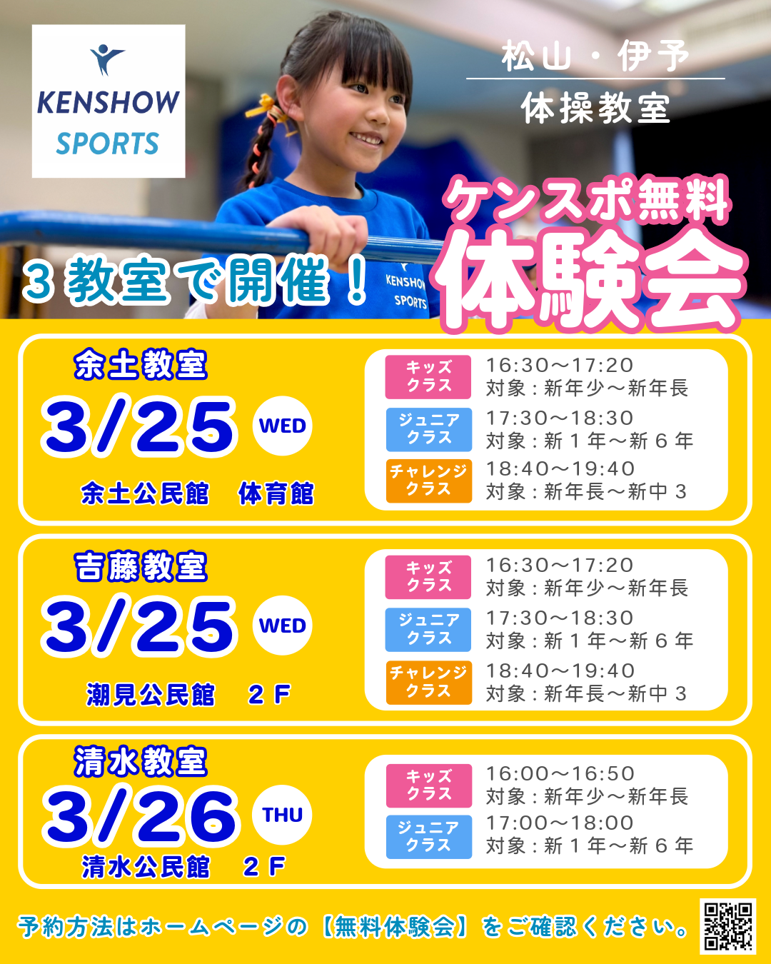 NEWS&TOPICS 02 27 🎈無料体験会🎈 🎈無料体験会🎈3教室で開催‼️ 対象:一般の方(会員の方は参加できません) 🟡予約方法🟡 Step.1 KENSHOW SPORTS ライン公式アカウントを友だち追加 Step.2 下記をトーク画面に入力し送信 【無料体験会予約】と入力 ・お子様のお名前(フリガナ) ・新学年(年齢) ・希望教室、クラス 体操教室 松山 伊予 ケンショウスポーツ Category :お知らせ « 🌈無料体験受付中🌈 Category お知らせ ご利用者の声 Archive 2026年2月 2026年1月 2025年12月 2025年10月 2025年6月 2025年2月 2024年12月 2024年7月 2024年6月 2024年3月 2023年11月 2023年7月 2023年6月 2023年5月 2023年4月 2023年2月 2022年11月 2022年10月 2022年9月 2022年8月 2022年7月 2022年6月 2022年3月 2021年11月 2021年10月 2021年8月 2021年7月 2021年6月 2021年2月 2020年11月 2020年10月 2020年4月 2019年12月 2019年11月 2019年9月 2019年8月 2019年7月 2019年6月 2019年5月 2019年4月