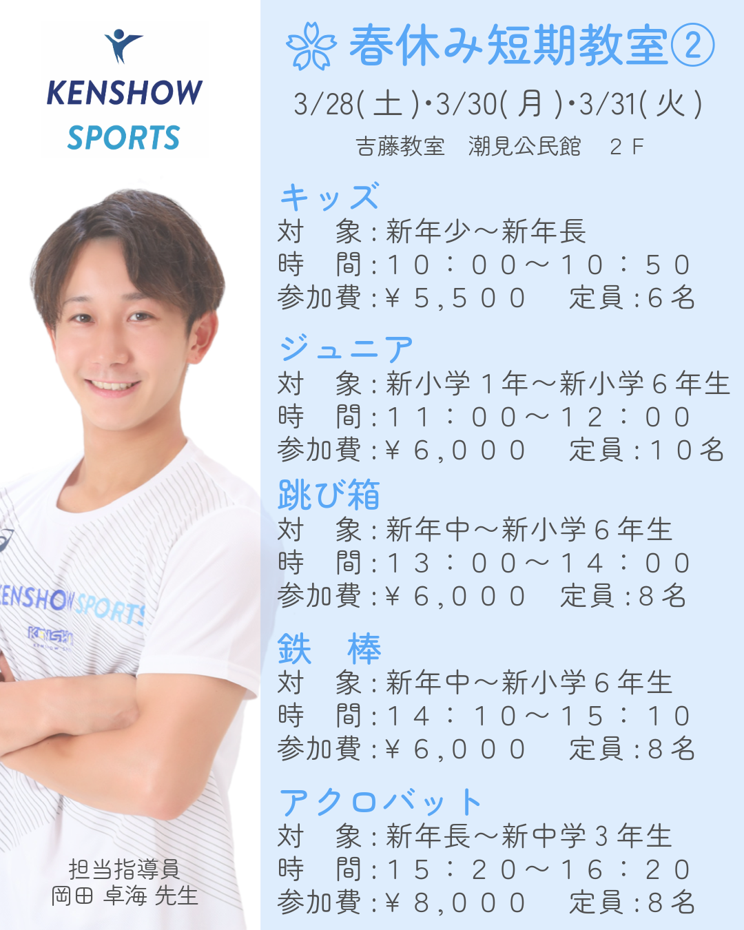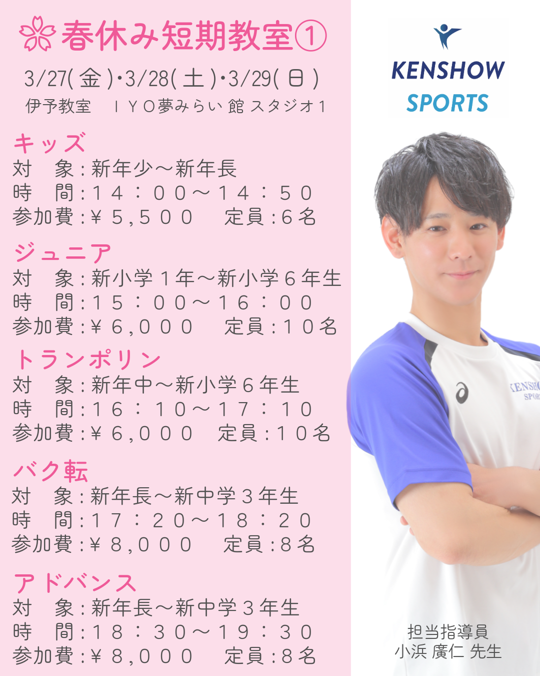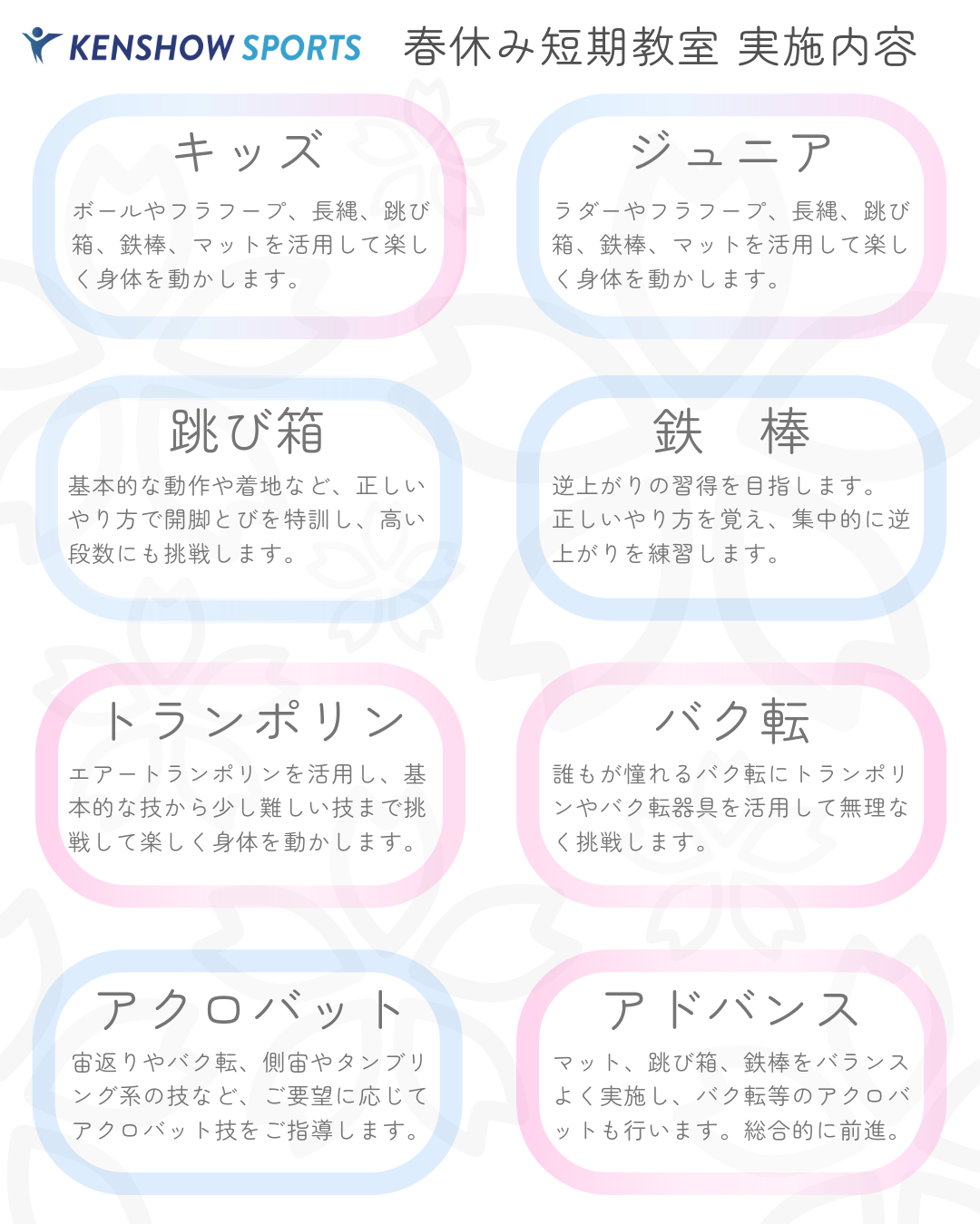 NEWS&TOPICS 02 28 🌸春休み短期教室🌸 ‼️予約受付中‼️ 🌸春休み短期教室参加入会特典🌸 入会金無料:5,000円→0円 🔵予約方法🔵 Step.1 KENSHOW SPORTSライン公式アカウントを友だち追加 Step.2 下記をトーク画面に入力し送信 【春休み短期教室予約】と入力 ・春休み短期教室番号(①or②) ・参加希望クラス ・新学年(年齢) ・お子様のお名前(フリガナ) 体操教室 松山市 伊予市 ケンショウスポーツ Category :お知らせ « 🎈無料体験会🎈 Category お知らせ ご利用者の声 Archive 2026年2月 2026年1月 2025年12月 2025年10月 2025年6月 2025年2月 2024年12月 2024年7月 2024年6月 2024年3月 2023年11月 2023年7月 2023年6月 2023年5月 2023年4月 2023年2月 2022年11月 2022年10月 2022年9月 2022年8月 2022年7月 2022年6月 2022年3月 2021年11月 2021年10月 2021年8月 2021年7月 2021年6月 2021年2月 2020年11月 2020年10月 2020年4月 2019年12月 2019年11月 2019年9月 2019年8月 2019年7月 2019年6月 2019年5月 2019年4月